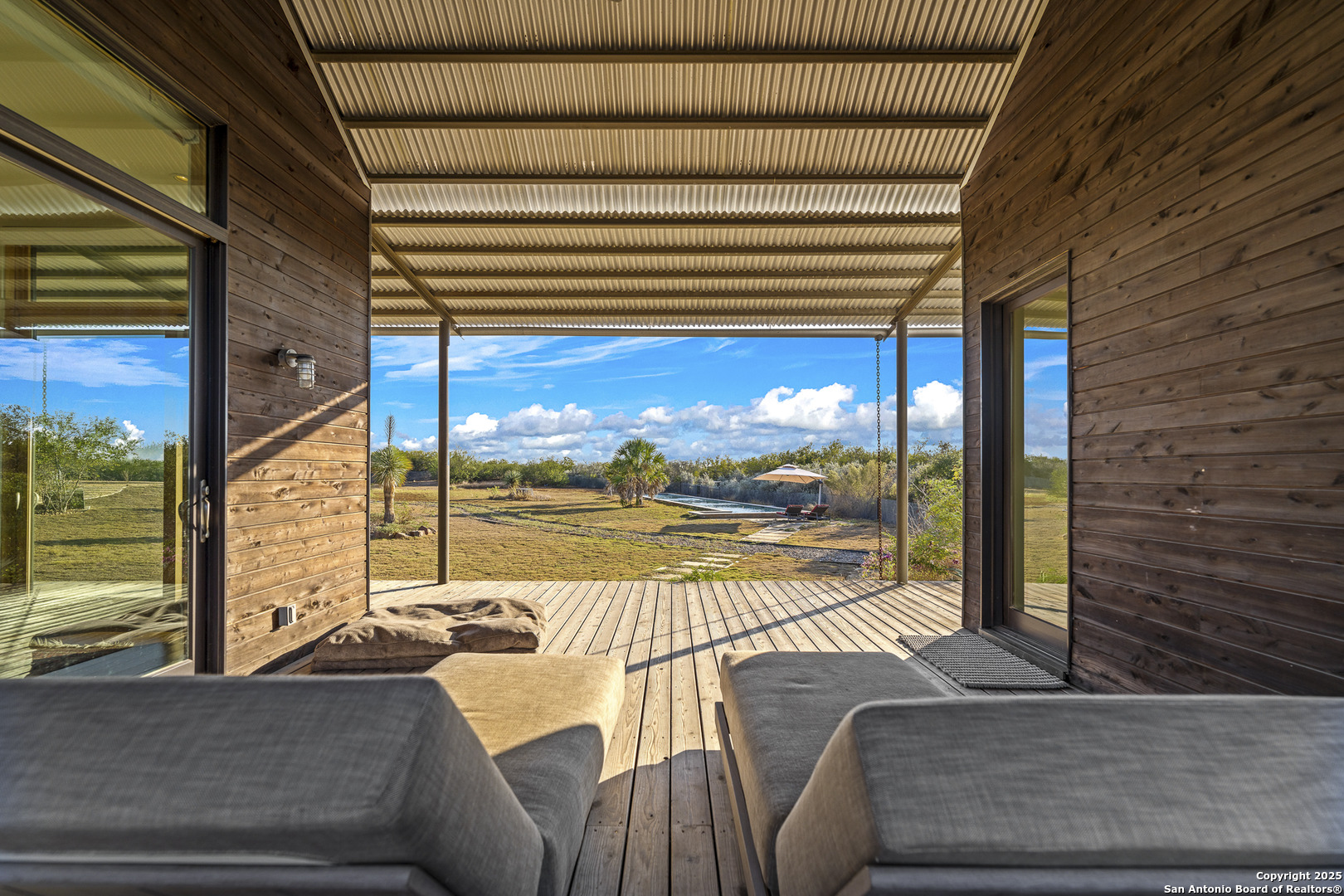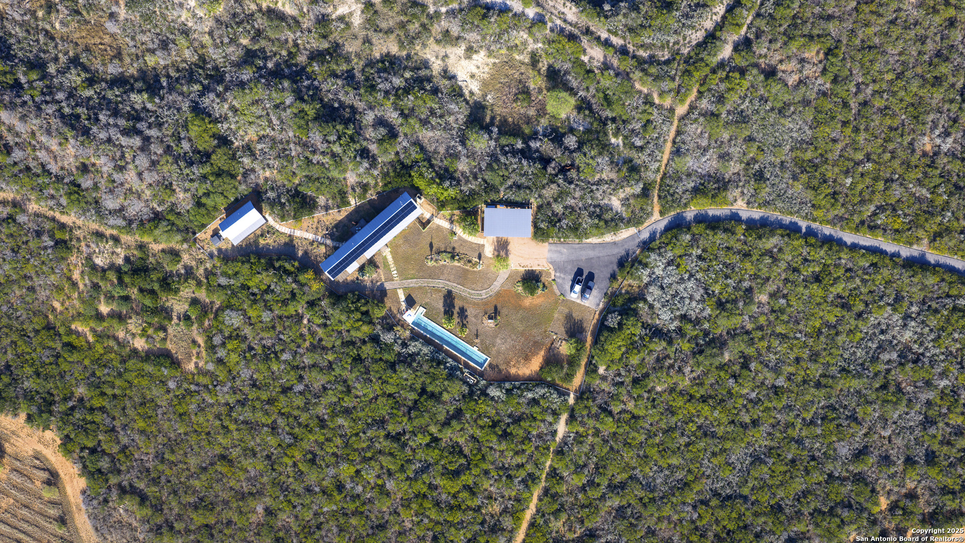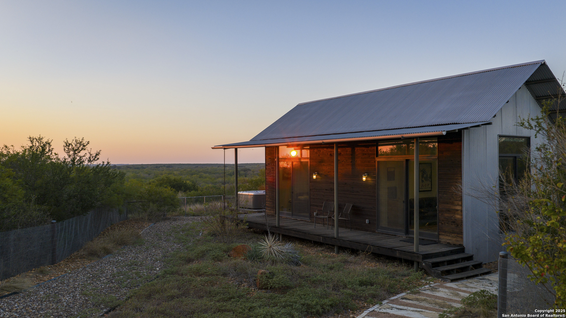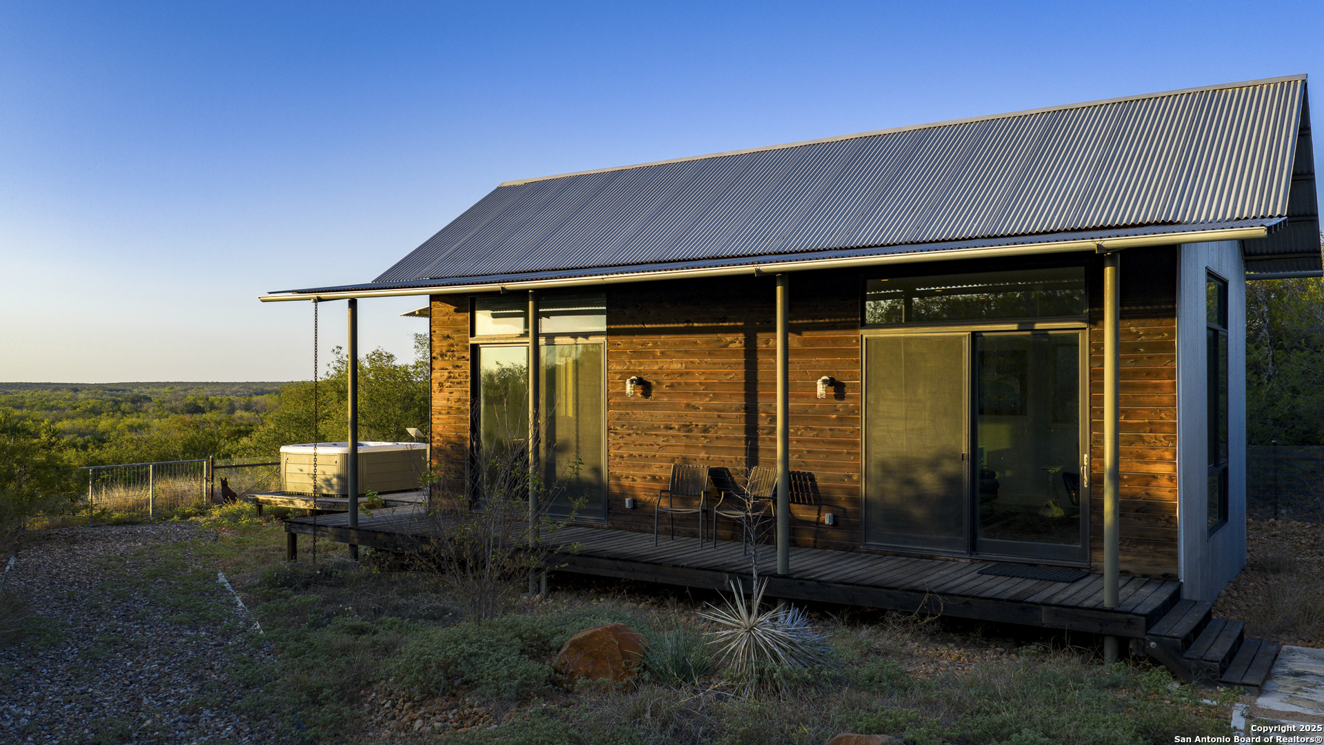 Perched atop the highest point of the ranch, this stunning Lake Flato Architects Porch House perfectly captures the essence of sustainable country living. Designed with simplicity, connection to the landscape, and modern efficiency in mind, this one-of-a-kind home is the centerpiece of this 83 acre Medina County retreat offering privacy, recreation, and off-grid independence. The Porch House consists of three distinct units connected by covered porches and walkways; each designed with purpose and style. All three units feature fossilized bamboo floors, eastern red cedar siding, Marvin windows, and their own A/C units, combining natural materials with modern comfort and exceptional craftsmanship: -The main living unit features a spacious living area with stunning views, a full kitchen, and a laundry room. -The primary suite unit offers a serene owner retreat with a full bath, walk-in closet, and outside shower. Just off the primary bedroom is a screened-in deck, perfect for relaxing and enjoying the hilltop breezes in comfort. -The third unit is a guest house, separate from the primary residence and includes two bedrooms and one bath, providing comfort and privacy for visitors. Between the primary suite and main living unit lies a cozy outdoor fireplace, the perfect place to take in the hilltop vistas and evening breezes. The western red cedar deck extends the living space outdoors, providing a warm, inviting area to enjoy the views and tranquil surroundings. Energy efficiency and self-sufficiency are at the heart of this property. The home is powered by 60 high-efficiency solar panels feeding two Tesla Powerwalls, providing reliable energy to all improvements around the home. Nearby amenities include covered parking for three vehicles, a storage shed, a hot tub with stunning views, and a 25-meter lap pool that overlooks the surrounding landscape. Just down from the main residence sit two metal barns. One includes a water well and cistern along with equipment storage, while the second barn fully insulated and air-conditioned is currently used as a private gym. Both barns are supported by 22kW Generac backup generators, ensuring continuous operation in any condition. The ranch is well-watered with two water wells, a 1/2 acre stocked tank(channel cats, hybrid bluegill, carp, and minnows), and 11 acre-feet of water rights from the Bexar-Medina-Atascosa Counties Water Control and Improvement District. Recreation abounds with a shooting range, excellent native brush cover(approximately 30% of the land), and strip-mowed areas designed to enhance quail habitat. Wildlife on the ranch includes whitetail deer, hogs, javelina, turkey, quail, and dove. The property also carries a wildlife tax exemption, adding to its appeal and efficiency. Mineral rights will convey with the sale. Every element of this property has been designed for off-grid living, blending architectural excellence with thoughtful sustainability. Whether used as a private homestead, weekend retreat, or recreational ranch, this Medina County property represents the ideal balance of modern comfort and natural beauty.