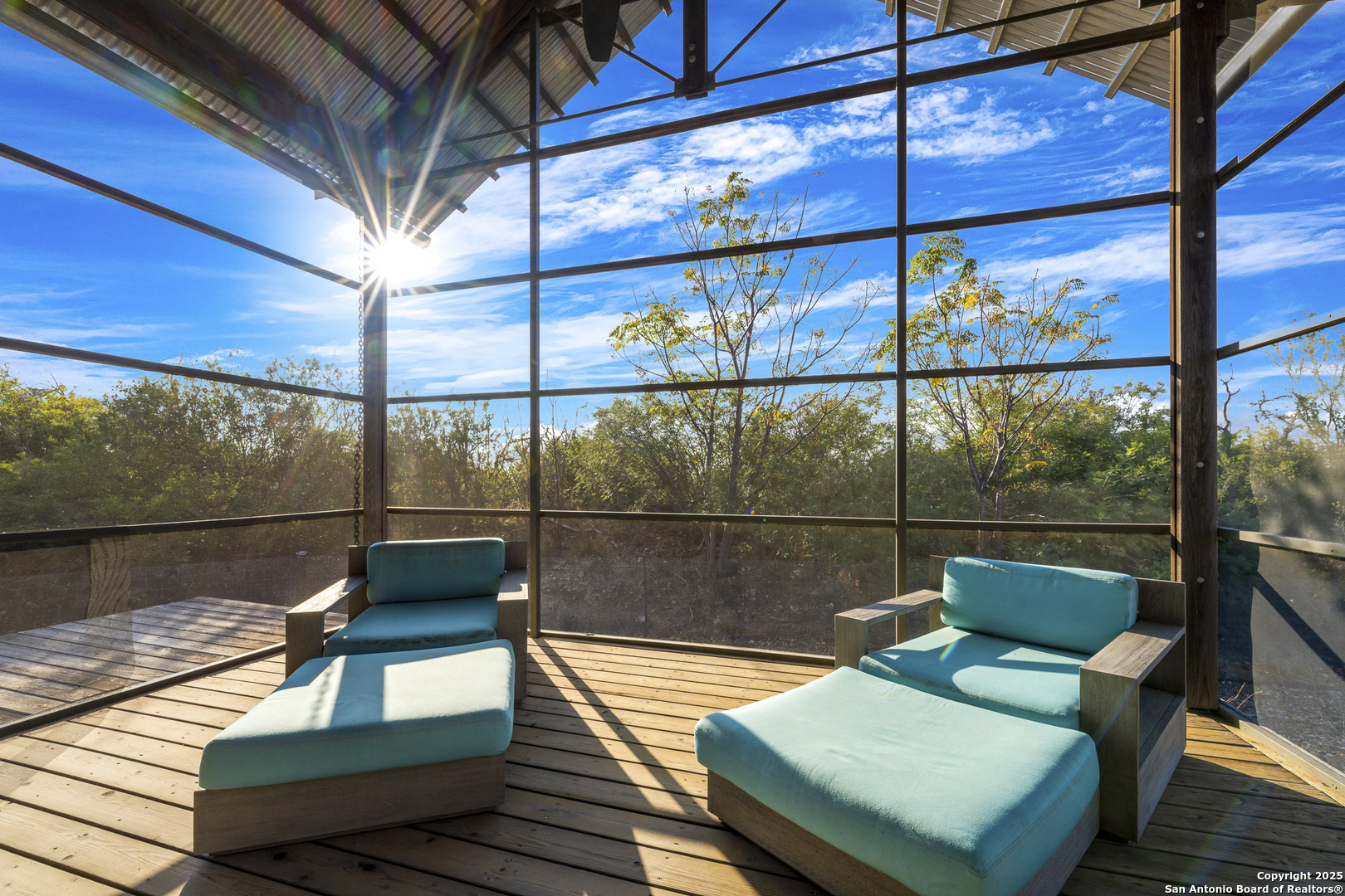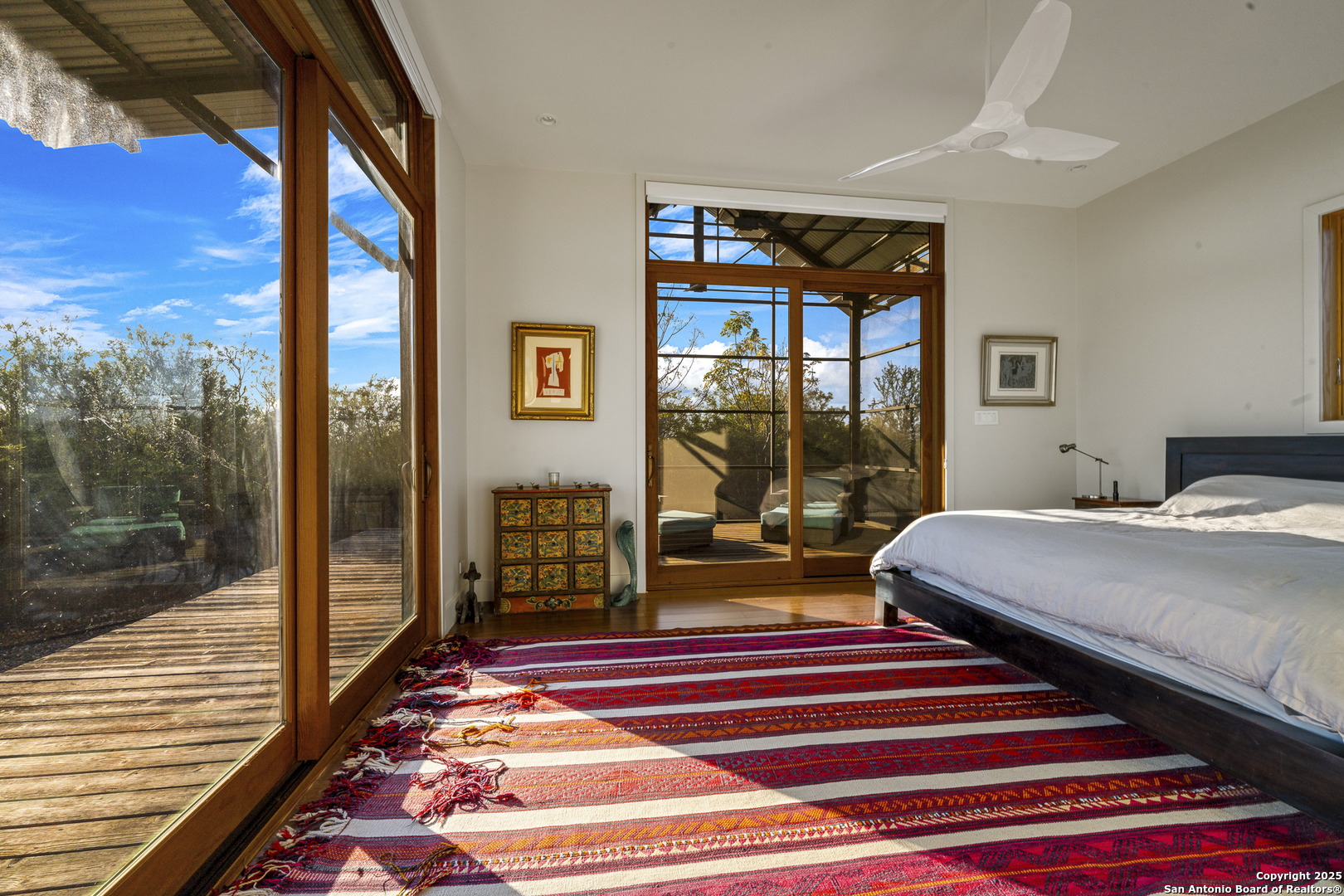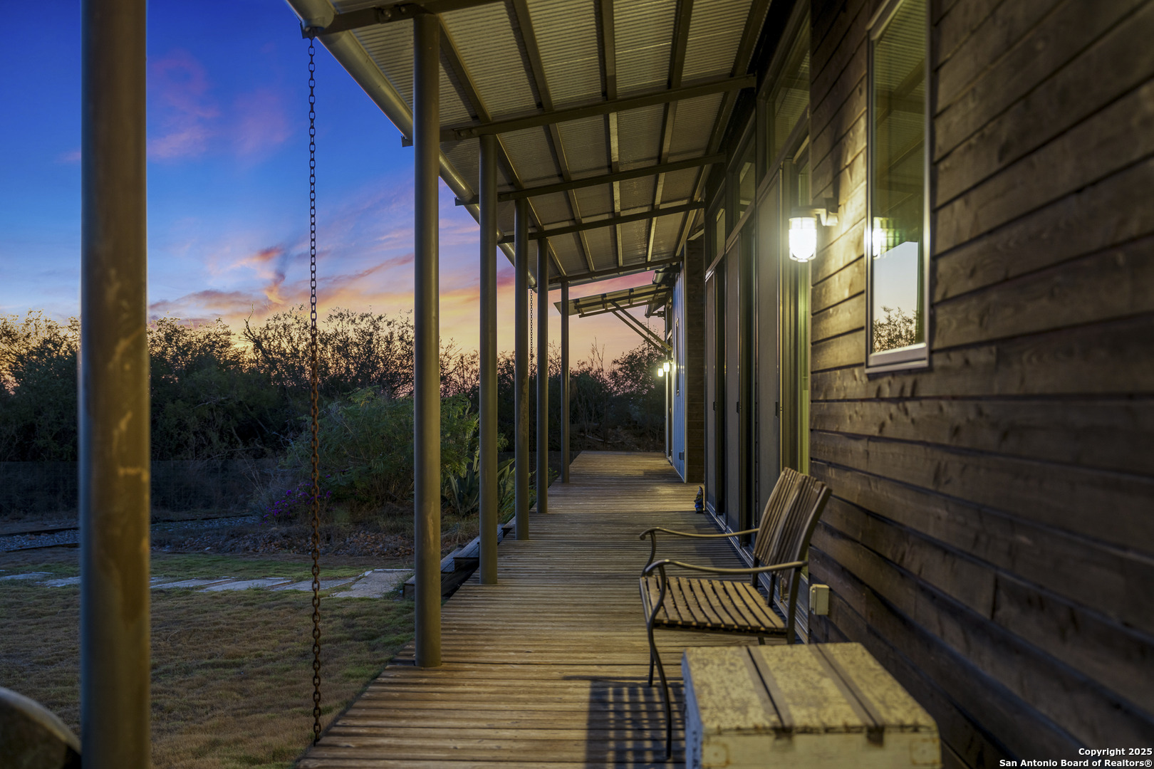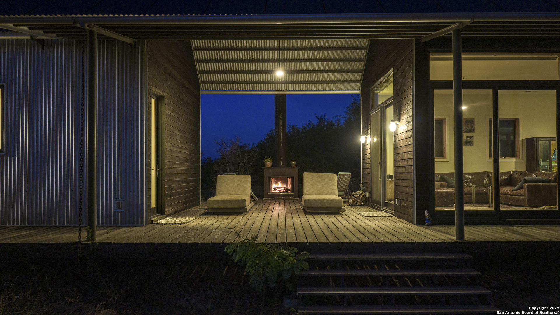 Perched atop the highest point of the ranch, this stunning Lake Flato Architects Porch House perfectly captures the essence of sustainable country living. Designed with simplicity, connection to the landscape, and modern efficiency in mind, this one-of-a-kind home is the centerpiece of this 83 acre Medina County retreat offering privacy, recreation, and off-grid independence. The Porch House consists of three distinct units connected by covered porches and walkways; each designed with purpose and style. All three units feature fossilized bamboo floors, eastern red cedar siding, Marvin windows, and their own A/C units, combining natural materials with modern comfort and exceptional craftsmanship: -The main living unit features a spacious living area with stunning views, a full kitchen, and a laundry room. -The primary suite unit offers a serene owner retreat with a full bath, walk-in closet, and outside shower. Just off the primary bedroom is a screened-in deck, perfect for relaxing and enjoying the hilltop breezes in comfort. -The third unit is a guest house, separate from the primary residence and includes two bedrooms and one bath, providing comfort and privacy for visitors. Between the primary suite and main living unit lies a cozy outdoor fireplace, the perfect place to take in the hilltop vistas and evening breezes. The western red cedar deck extends the living space outdoors, providing a warm, inviting area to enjoy the views and tranquil surroundings. Energy efficiency and self-sufficiency are at the heart of this property. The home is powered by 60 high-efficiency solar panels feeding two Tesla Powerwalls, providing reliable energy to all improvements around the home. Nearby amenities include covered parking for three vehicles, a storage shed, a hot tub with stunning views, and a 25-meter lap pool that overlooks the surrounding landscape. Just down from the main residence sit two metal barns. One includes a water well and cistern along with equipment storage, while the second barn fully insulated and air-conditioned is currently used as a private gym. Both barns are supported by 22kW Generac backup generators, ensuring continuous operation in any condition. The ranch is well-watered with two water wells, a 1/2 acre stocked tank(channel cats, hybrid bluegill, carp, and minnows), and 11 acre-feet of water rights from the Bexar-Medina-Atascosa Counties Water Control and Improvement District. Recreation abounds with a shooting range, excellent native brush cover(approximately 30% of the land), and strip-mowed areas designed to enhance quail habitat. Wildlife on the ranch includes whitetail deer, hogs, javelina, turkey, quail, and dove. The property also carries a wildlife tax exemption, adding to its appeal and efficiency. Mineral rights will convey with the sale. Every element of this property has been designed for off-grid living, blending architectural excellence with thoughtful sustainability. Whether used as a private homestead, weekend retreat, or recreational ranch, this Medina County property represents the ideal balance of modern comfort and natural beauty.