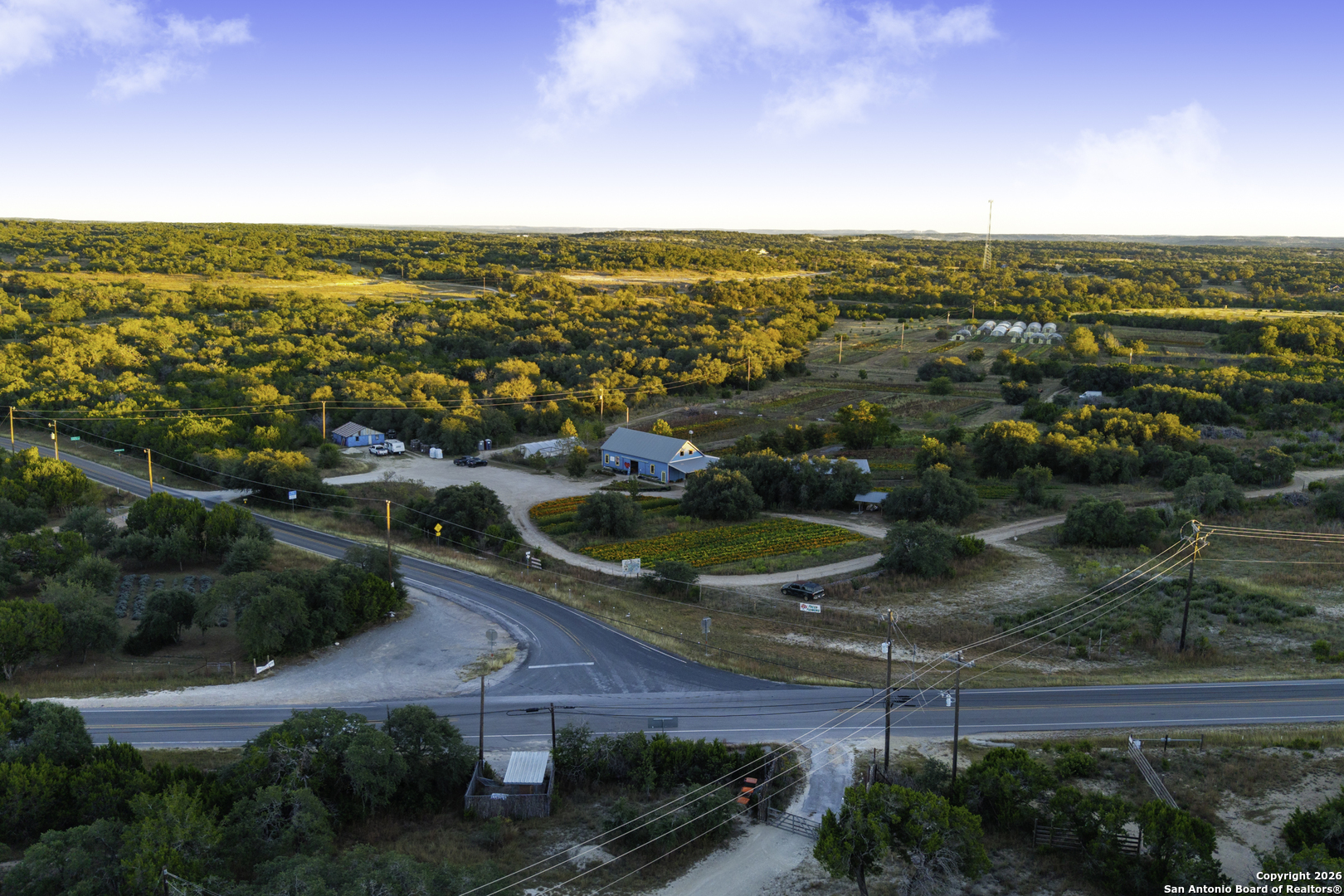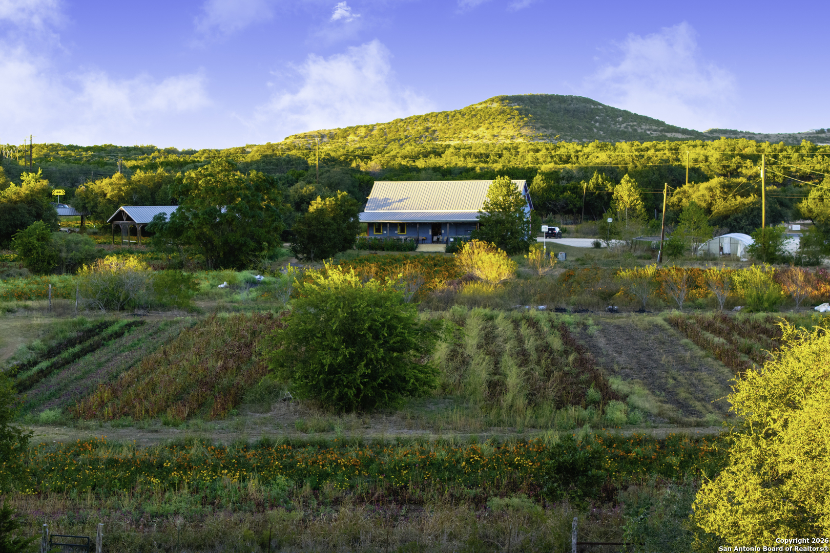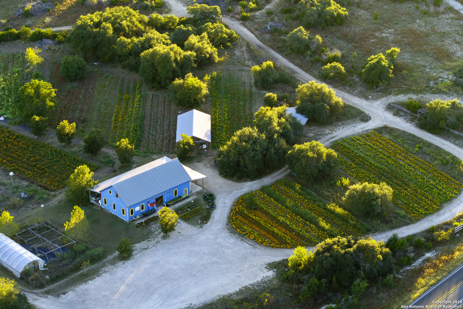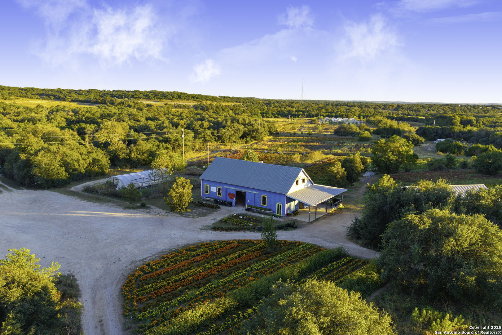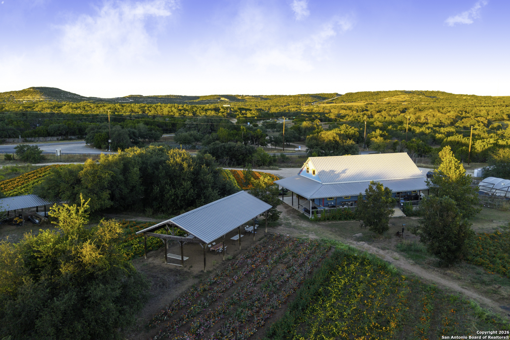 Arnosky Family Farms is a rare 60 acre property in the heart of the Texas Hill Country-an established Blanco County flower farm with deep community roots. Positioned with roughly 900 feet of combined frontage at the corner of RR 165 and FM 2325, it offers strong visibility and significant commercial potential while still feeling like a peaceful working farm. The property has been featured in Southern Living, Texas Highways, and other publications. Location: ~10 minutes to Blanco, ~20 minutes to Dripping Springs, and ~45 minutes to Austin. Land/Operation: Long operated as a Certified American Grown flower farm with deep, cultivated soils, production greenhouses, orchards, and paper shell pecans; appr 20 acres in active cultivation and ~40 acres of open green space. Diverse habitat with hardwoods and signature live oaks, multiple paddocks, and abundant wildflowers along an old rock wall. Per seller, land has been farmed for 150+ years and was part of the historic Peyton Colony. Improvements: The "Blue Barn" (~30' 60') with broad rear porches overlooking the fields, plus a stage and excellent acoustics; adjacent ~24x40 pavilion strung with lights for markets, tastings, weddings, and gatherings. Utilities in place across the acreage. Seller reports no restrictions; buyer to verify. Use potential includes continued agriculture, event/hospitality, tasting room concepts, boutique lodging, restaurant, private estate/compound, or a blend of uses (subject to buyer due diligence). Shown by appointment only. Buyer to verify all information including utilities, restrictions, acreage, and development feasibility.