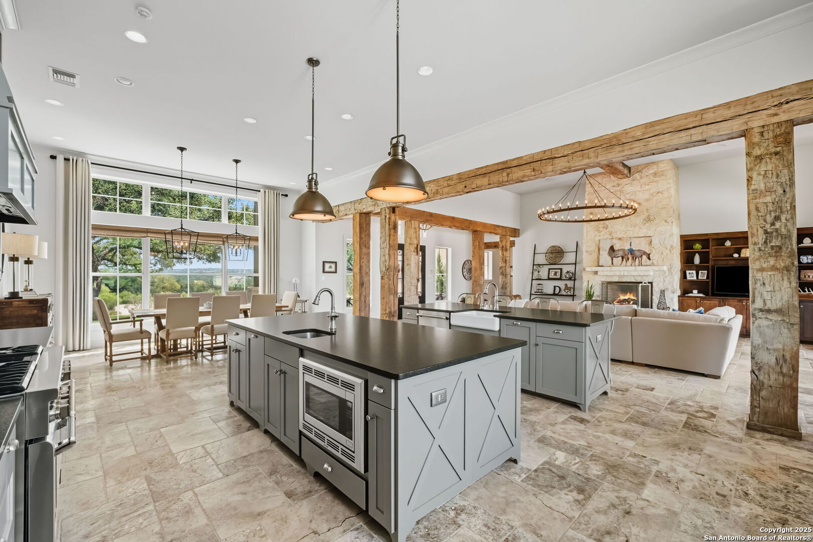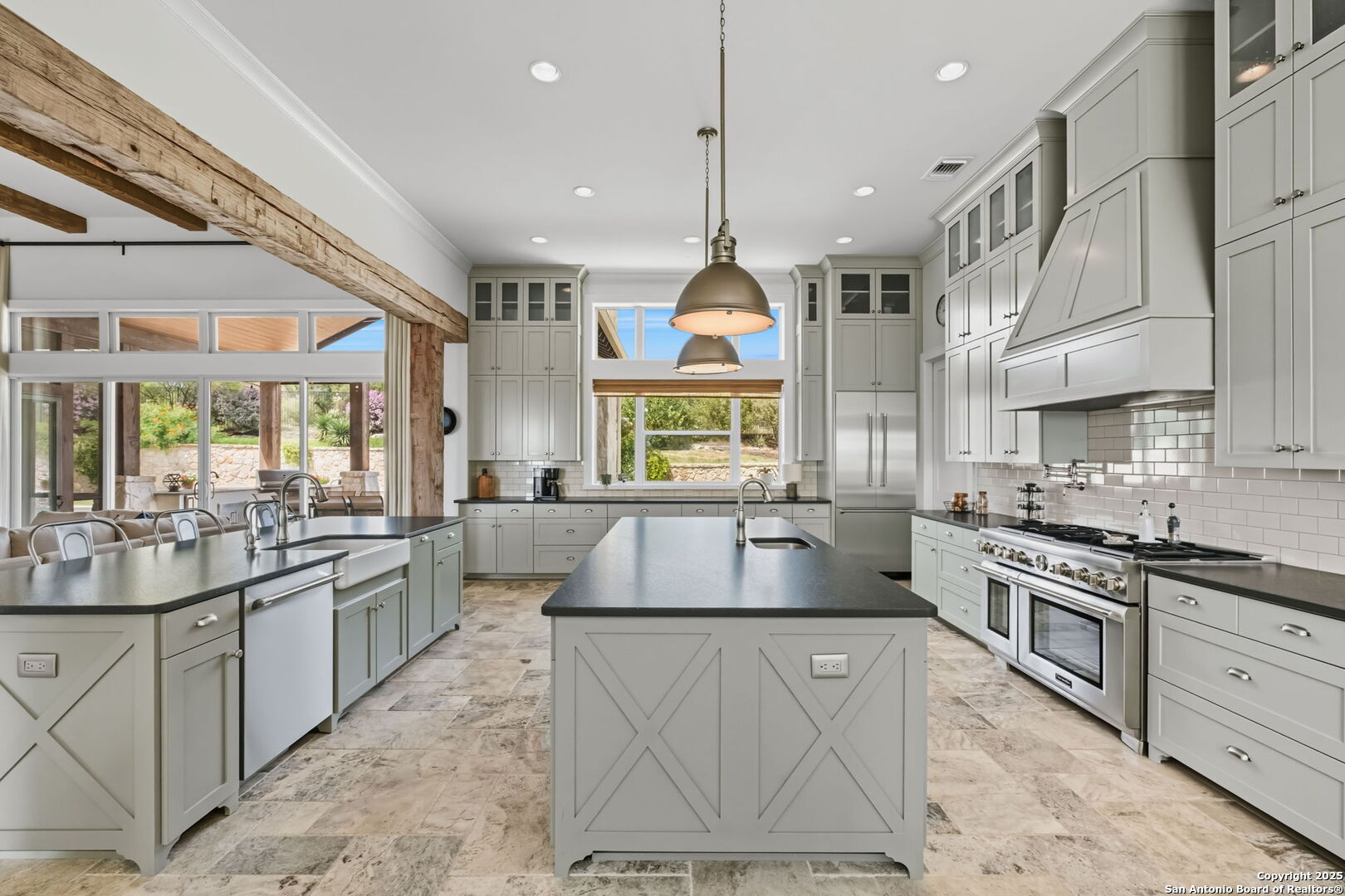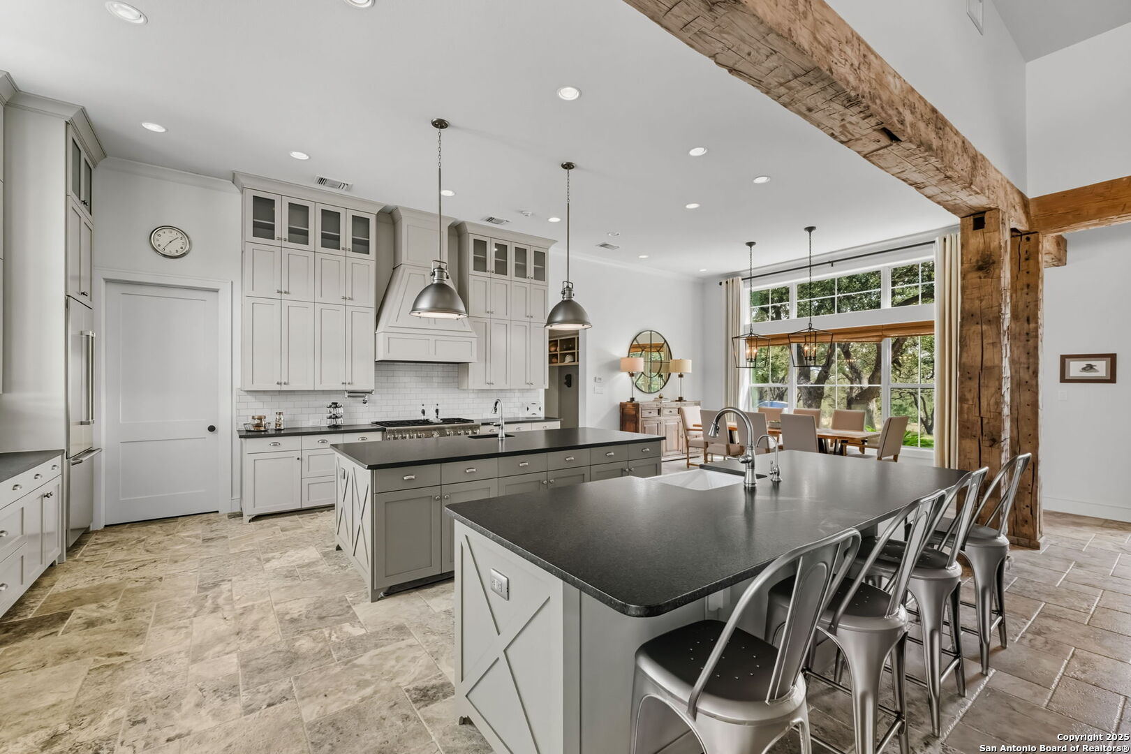 Distinguished Hill Country retreat, set on 15.41 acres, delivers refined craftsmanship, privacy and commercial grade horse facilities in the peaceful gated community of Rebecca Creek Ranches. Designed for sophisticated equestrian living, this property features an impressive 1,216 sqft. barn with two handcrafted 14'x16' stalls, a holding area, a wash rack, a fenced corral and fenced pastures that will exceed expectations. Inside, the elevated finishes and architectural details define every space. The gourmet double-island kitchen is a showpiece with stone countertops, professional-grade stainless steel Thermador appliances, a six-burner double gas range, two sinks, exquisite custom cabinetry, a large walk-in pantry, and a striking built-in wine fridge. Seamlessly flowing off of the kitchen, the grand living room showcases historic reclaimed wood beams, an awe-inspiring stone fireplace and a wall of glass sliding doors overlooking the picturesque pool and spa, filling the home with an abundance of warm natural light. The thoughtfully curated floor plan elevates daily living, offering 4 spacious bedrooms, each with a private en-suite bath. The luxurious primary suite is down with a spa-inspired bath, an oversized walk-through shower, 2 separate vanities, 2 separate walk-in closets and offers direct outdoor access to the screened porch and backyard sanctuary. The main level guest suite is secluded with a full en-suite bath and private outdoor access to a covered terrace designed to capture sweeping tranquil views. The spacious third bedroom is upstairs and offers a full en-suite bath and private outdoor access to a covered balcony overlooking serene vistas and pastoral views. Outside of the bedroom, custom cabinetry with a coffee station and beverage refrigerator thoughtfully connects to the fourth bedroom and fourth en-suite bath. A dedicated office is on the main level, complemented with large windows capturing countryside views and can easily serve as a flex space or game room. Conveniently positioned between the kitchen and garage, the spacious laundry room is framed by large windows and features a built-in sink and an additional refrigerator for added functionality. The notable half bath completes the interior and offers direct outdoor access to the luxurious pool and spa. The polished 3-car garage is attached with epoxy finished floors and separate workshop that offers versatile additional space and is presently utilized for beekeeping providing the current owner with an agricultural tax exemption. The outdoor living space unfolds as a beautifully curated retreat featuring a heated pool and spa, a prestigious covered patio, kitchen and fireplace, multiple terraces and professionally landscaped grounds, offering an unapparelled resort-style experience at home. Additional amenities include a raised vegetable and herb garden, a private well with a 5,200-gallon storage tank and a state-of-the-art geothermal heating and cooling system offering exceptional energy efficiency and comfort. Set within a quiet, gated neighborhood in Comal County, this extraordinary estate enjoys convenient proximity to New Braunfels, Boerne, San Antonio and Austin. Served by the highly acclaimed Comal Independent School District and zoned to the sought-after Smithson Valley high school.