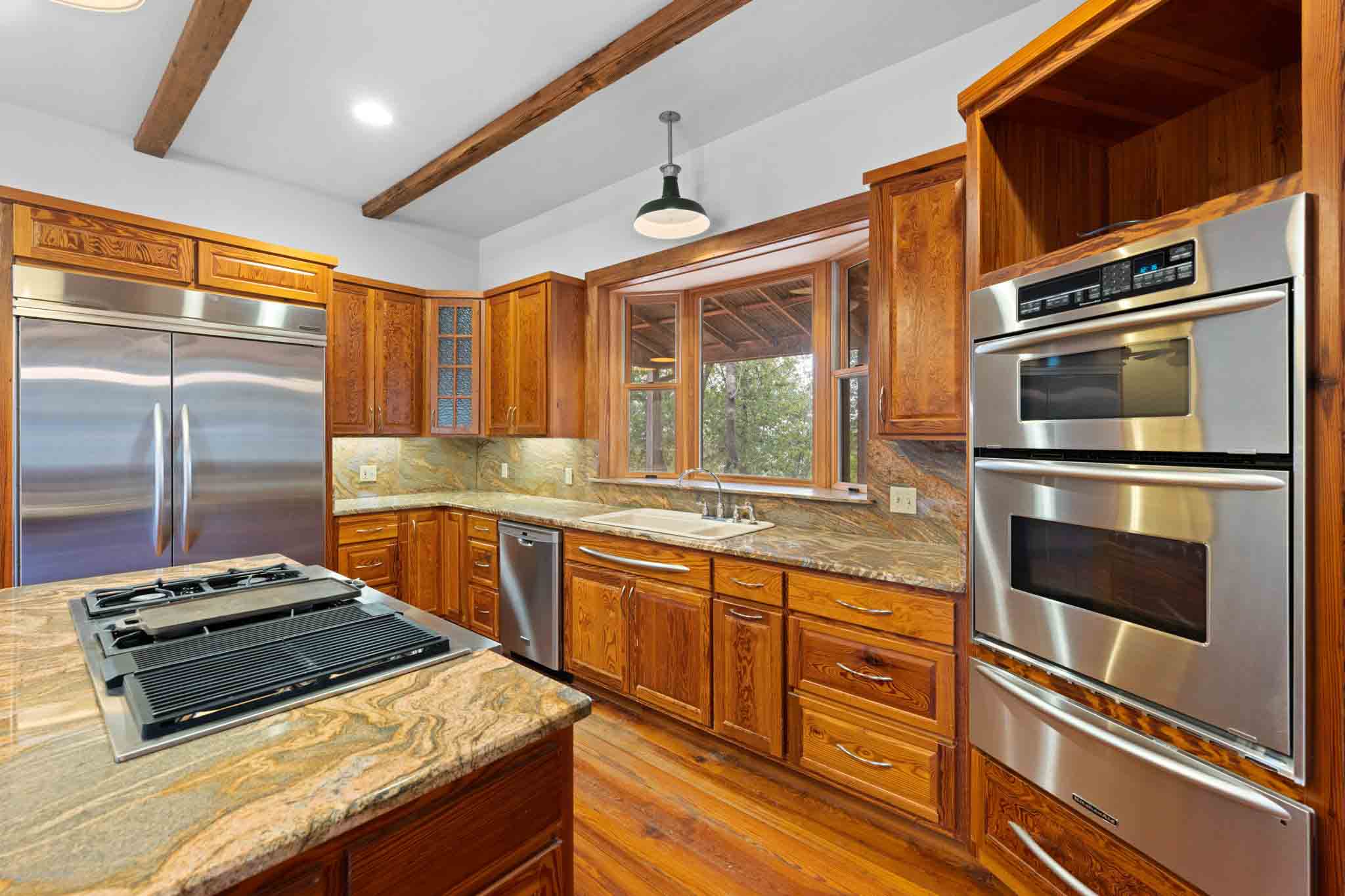 The living room is spacious, with a stacked limestone fireplace taking center stage. High vaulted ceilings with beautiful exposed wooden beams bring great character to the room. The open floor plan allows a smooth transition into the spacious kitchen, which features a large granite island with a Jenn-Air gas burner, a prep sink, and seating for barstools. Underneath the island is ample cabinet space. Additional cabinet space is present on the secondary countertop, which also includes a beautiful farm sink. The kitchen also features a KitchenAid refrigerator and a built-in matching KitchenAid oven with warming tray.