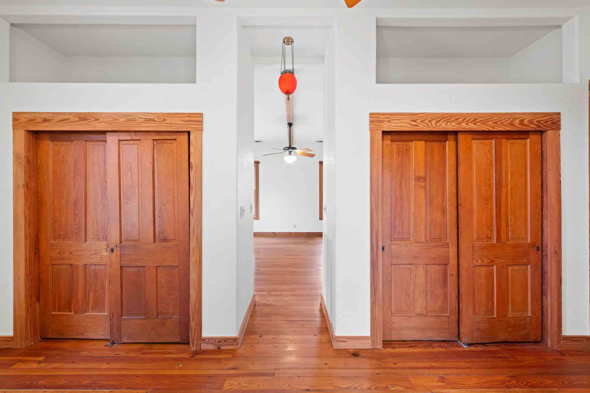 The guest wing provides two additional bedrooms and a single full bathroom with the same quality finishes, most notably the louvered closet doors and antique doors with etched glass.