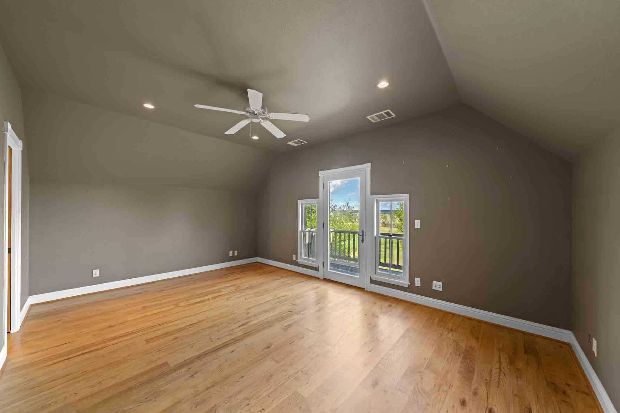 A concrete slab wraps around the building on all four sides and is covered by an awning. The slab extends approximately 20’± wide in the front and 10’± wide on the remaining three sides. The exterior is finished in dark gray corrugated steel, blending beautifully with the massive post oak trees that surround it.