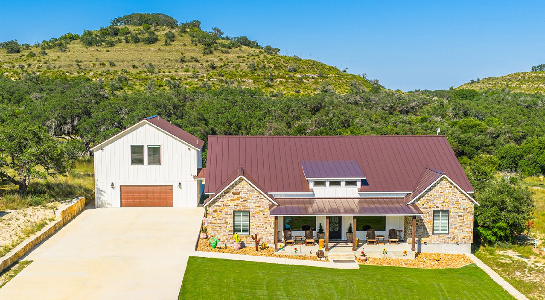 NEW! Exceptionally beautiful and well-located—Big Chief Ranch is 26± acres, offering luxurious modern living with an impressive Hill Country landscape backdrop featuring rolling hills in the distance. The property features a 3,085± sf main home, a detached garage with an upstairs guest apartment, and gentle rolling terrain dotted with mature live oaks, native grasses, and a stock tank.